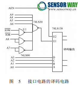 3、信號(hào)的輸出部分 信號(hào)的輸出部分包括接口電路和 顯示。接口電路部分采用了可編程輸入 輸出接口片子8255,通過(guò)它可直接將 CPU總線接向外設(shè)。我們選用8255的 能輸入/輸出方式,完成微型記錄盒與 PC機(jī)數(shù)據(jù)傳送。為了方便計(jì)算機(jī)正確 地找到該接口電路,賦予8255接口特 定的地址,通過(guò)口地址譯碼確定接口電 路地址。譯碼電路如圖5所示。選擇采 用數(shù)據(jù)查詢式傳送方式向外界傳送數(shù) 據(jù),其優(yōu)點(diǎn)是當(dāng)CPU與外部過(guò)程不同 步時(shí),也可以很好地解決CPU的時(shí)序 和I/O端口的時(shí)序之間的配合問(wèn)題,從 而不同外設(shè)的狀態(tài)信息,可以使用同一 端口,而使用不同的位就行。結(jié)果顯示 部分由液晶顯示塊顯示。選用點(diǎn)陣式液 晶顯示塊顯示心音和心電中心臟跳動(dòng) 次數(shù)及記錄儀的工作時(shí)間、狀態(tài)等。