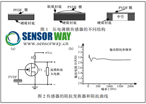壓電薄膜傳感器的設(shè)計(jì)主要考慮了傳感器的靈敏度 和信噪比,根據(jù)測(cè)量信號(hào)的頻率和響應(yīng)幅度,我們?cè)O(shè)計(jì) 薄膜傳感器的結(jié)構(gòu)有如同圖1所示的幾種。在采集人體 心音的信號(hào)時(shí),由于心音的頻響范圍較寬,同時(shí)其輸出 的物理信號(hào)值也很微弱,采用硬質(zhì)襯底和中空的設(shè)計(jì)。 這樣可以提高傳感器中薄膜在收到心音信號(hào)時(shí)的形變 量,從而提高信號(hào)強(qiáng)度。這樣結(jié)構(gòu)設(shè)計(jì)的缺點(diǎn)是結(jié)構(gòu)不牢固,使用時(shí)間長(zhǎng)了需要校正。