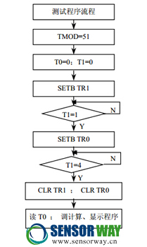 計(jì)算程序中,根據(jù)實(shí)際測(cè)量精度, 選擇單片機(jī)定時(shí)器/計(jì)數(shù)器T0作為定 時(shí)器,而定時(shí)器/計(jì)數(shù)器T1作為計(jì)數(shù) 器,且都工作于16位計(jì)數(shù)器操作模式 0為定時(shí)器時(shí),選取定時(shí)時(shí)間為5ms, 另設(shè)定一計(jì)數(shù)器CR。根據(jù)公式: (216-X)X:T1=72計(jì)算出X值。其中 71為一個(gè)機(jī)器周期時(shí)間,:T2為定時(shí)時(shí) 間。首先設(shè)定模式控制字,接通T1計(jì) 數(shù)器,當(dāng)外部脈沖的第一個(gè)下降沿到時(shí) 即TL1=1時(shí),T0開(kāi)始計(jì)數(shù),當(dāng)其溢出 產(chǎn)生中斷時(shí),CR開(kāi)始計(jì)數(shù),直到TL1=4時(shí),T0、T1停 止計(jì)數(shù),讀取寄存器值,計(jì)算最終結(jié)果。簡(jiǎn)單的程序流 程圖如圖 6。