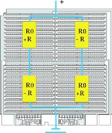 現(xiàn)代傳感器系統(tǒng)主要由兩個(gè)元件組成 —基本傳感器和信號(hào)處理專用集成電路 (ASIC)(圖 1),F(xiàn)已證明,后來(lái)由 Lord Klevin 于 1857 年發(fā)現(xiàn)的各向異性磁阻效應(yīng)特別適用于檢測(cè)磁場(chǎng)。首先考慮通常具有多種磁疇結(jié)構(gòu)的鐵磁性材料。這些稱之為韋斯磁疇的結(jié)構(gòu),其內(nèi)部磁化的方向彼此不同。如果將這種材料平鋪為一薄層,那么磁化矢量處于材料層平面方向。另外,可較精確地假設(shè)只存在一個(gè)磁疇。當(dāng)這種元件暴露于外部磁場(chǎng)中時(shí),后者會(huì)改變內(nèi)部磁化矢量的方向。如果同時(shí)一股電流通過(guò)該元件,就會(huì)產(chǎn)生電阻(圖 2),這取決于電流和磁化之間的角度。當(dāng)電流和磁化方向彼此成直角時(shí),電阻最小,當(dāng)二者平行時(shí),電阻最大。電阻變化的大小取決于材料。鐵磁性材料的性質(zhì)也決定對(duì)溫度的依賴性。電阻最大變化為 2.2% 并且對(duì)溫度變化反應(yīng)良好的最佳合金是 81% 的鎳和 19% 的鐵組成的合金。恩智浦所有傳感器系統(tǒng)中的基本傳感器都采用這種強(qiáng)磁鐵鎳合金。在惠斯登電橋電路中單獨(dú)配置幾個(gè) AMR 電阻,以增強(qiáng)輸出信號(hào)并改善溫度反應(yīng)特性。此電路也可在制造過(guò)程中進(jìn)行微調(diào)。圖 3 顯示如何在裸片上配置 AMR 元件。