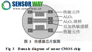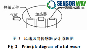 風速傳感器正反風向識別基于熱膜兩邊的熱敏元件的溫差的正負,當風速不為零時,風流過熱膜帶走熱量并傳遞 給一個熱敏元件,引起熱敏元件特征阻值的升高,兩熱敏電 阻產生溫差,假設此時溫差為正,風向設為正向;則風向改 變成反向時,溫差為負,由此根據溫差正負可以判斷風的正反向。