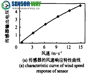 2)風速傳感器采用恒溫式工作原理,通過測試,可實 現0. 2~15m/s范圍內的風速測量,熱響應時間為0. 5 s,溫 度傳感器不但能測試0〜120 "C的風溫,而且,運用2個熱 敏元件的溫差實現風向識別;