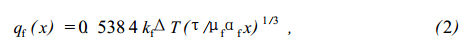 式中X為流過熱源表面的距離,m+ kf為流體的熱導率, W.K-1.m-1,為黏度系數,kg m-1 s- + af為熱擴散率,