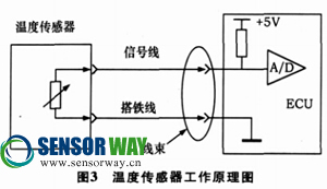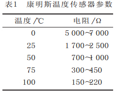 電控柴油發(fā)動(dòng)機(jī)上使用的溫度傳感器為二線式熱敏式溫度傳感器, 其外形如圖2所示。隨著溫度的升高, 熱敏電阻的阻值降低, 正常情況下阻值在500Ω~40kΩ之間變化, 表1所示為一個(gè)典型的康明斯溫度傳感器參數(shù), 具體參數(shù)值請參照隨電路圖提供的傳感器技術(shù)參數(shù)表。圖3為溫度傳感器的工作原理圖。隨著溫度的升高, 熱敏電阻值降低, 從而使信號(hào)電壓降低, 根據(jù)溫度傳感器的工作原理, 可以用檢查熱敏電阻阻值的方法檢查溫度傳感器, 通過對(duì)比實(shí)際測量所得的電阻值和參數(shù)表中的電阻值, 來判斷溫度傳感器是否正常。