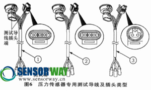 大部分壓力傳感器無法通過測量電阻的方式來判斷好壞, 而是需要在壓力傳感器工作時(shí)通過輸出的信號(hào)電壓來判斷。因此在檢測壓力傳感器時(shí)需要專用的檢測導(dǎo)線, 保證傳感器正常工作的同時(shí)將3條線引出供檢測, 不同的壓力傳感器需要不同的檢測導(dǎo)線。圖6為3種不同的壓力傳感器測試插頭。