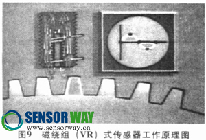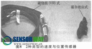 速度與位置傳感器是電控發(fā)動(dòng)機(jī)上用于檢測發(fā)動(dòng)機(jī)運(yùn)行速度和凸輪軸位置的傳感器。常用的有2種不同形式的速度傳感器: 磁繞組(VR) 式和霍爾效應(yīng)式, 如圖8所示。