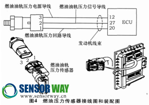 康明斯發(fā)動(dòng)機(jī)上使用的壓力傳感器有2種: 一種是電容式壓力傳感器; 另外一種是壓電晶體式傳感器。2種傳感器均為3線式, 2根電源線向傳感器提供5V的工作電壓, 1根信號(hào)線向ECU提供壓力信號(hào)電壓。燃油壓力傳感器接線圖和裝配圖如圖4所示。