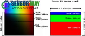 簡單來說,這項技術(shù)有點像適馬Foveon X3傳感器的衍生版本。Foveon X3是將藍、綠、紅三色層按照波長自上而下排列,TFD同樣也利用了不同波長(色彩)光線在硅材料里的傳播特性。但不同的地方在于,TFD用硅材料替換掉了原先的標準RGB陣列,并把不同深度的色彩數(shù)據(jù),分多層記錄下來。