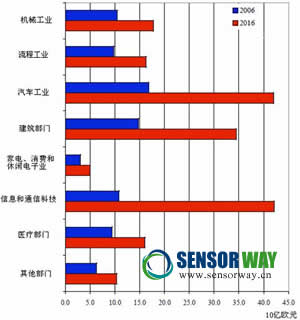 生產(chǎn)過程、現(xiàn)代汽車、創(chuàng)新的醫(yī)療設(shè)備、智能供電系統(tǒng)和建筑技術(shù)都離不開傳感器,傳感器滲透領(lǐng)域越來越多,并不斷開拓新的應(yīng)用領(lǐng)域。圖1是2006年和2016年全球民用傳感器主要應(yīng)用領(lǐng)域情況。在2006年傳感器816億歐元的市場規(guī)模中,12.9%的需求來自機械行業(yè),12.0%來自流程工業(yè),20.6%來自汽車行業(yè)(包括飛機、船舶和軌道車輛),18.2%來自建筑行業(yè),3.8%來自家電和消費電子業(yè),13.3%來自信息和通信行業(yè)。隨著智能移動通信技術(shù)和平板電腦的持續(xù)繁榮、駕駛員輔助系統(tǒng)和混合動力電動汽車的快速增長,刺激了信息和通信業(yè)、汽車行業(yè)對傳感器的急劇需求。在由INTECHNO公司預(yù)測的2016全球傳感器1844億歐元的市場規(guī)模中,信息和通信業(yè)、汽車行業(yè)對傳感器的需求最高,分別高達22.9%和22.8%,其次依次是建筑業(yè)(占18.1%)、機械工業(yè)(占9.7%)、流程工業(yè)(占8.9%)、醫(yī)療部門(占8.8%)、家用電器和消費電子業(yè)(占2.7%)。此外,環(huán)保、基礎(chǔ)設(shè)施等其他部門對傳感器的需求也日益增長。