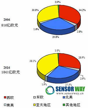 從各國對傳感器的需求看,德國和日本機械行業(yè)的需求最高,尤其是德國傳感器市場整體地位強大,其次是美國的信息和通信業(yè)、流程工業(yè)。在2011年全球傳感器1194億歐元的市場規(guī)模中,西歐占31.8%、東歐占2.8%、北美占28.3%、南美占1.7%、亞太地區(qū)占34.4%,其他地區(qū)占1.0%。圖2是2006年和2016年世界主要地區(qū)民用傳感器的市場份額,從中可以看出,西歐正在逐漸失去傳感器世界市場份額,亞太地區(qū)則呈不斷增長趨勢,主要原因是西歐傳感器買家大多是在機械等傳統(tǒng)行業(yè),在信息和通信技術(shù)等領(lǐng)域并不占據(jù)主導(dǎo)地位,而這恰是未來傳感器市場的主要增長領(lǐng)域,近年來中國、印度和東南亞等亞太地區(qū)國家對傳感器的需求則非常強勁。