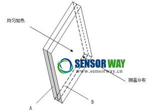 如圖所示,均勻地加熱A板,當(dāng)A板溫度升高時,熱量就向B板流去,B板溫度也隨之升高。如果兩板交界面焊接良好,熱量將均勻地流向B板子,B板表面的溫度應(yīng)該是均勻一致的。如果交界面某一部位沒有焊接好,熱流流到這里就會受到阻礙,B板外表面與此部位相對應(yīng)的位置上就會出現(xiàn)溫度異常的現(xiàn)象。