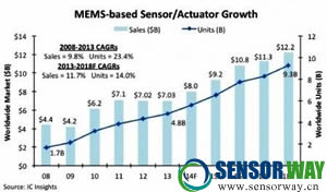 IC Insights預(yù)期,MEMS組件(包含傳感器與驅(qū)動(dòng)器)市場規(guī)模在2014年可達(dá)到80億美元,成長率是14%;至于明年,該機(jī)構(gòu)預(yù)期MEMS市場將進(jìn)一步成長16%,營收規(guī)模92億美元。在2013至2018年間,預(yù)期該市場平均年復(fù)合成長率為11.7%,整體規(guī)模將在2018年達(dá)到122億美元;至于MEMS組件出貨量則成長速度更快,在同一期間平均年成長率可達(dá)14%,而這也是MEMS組件平均價(jià)格出現(xiàn)大幅下降的主要原因。