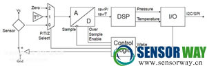 DLVR 是一個(gè)帶有信號(hào)路徑的數(shù)據(jù)傳感器,包括一個(gè)傳感元件、一個(gè) 14 位模數(shù)轉(zhuǎn)換器、一個(gè) DSP 和一個(gè)支持 I²C 或 SPI 的 I/O 塊(圖 1b)。 傳感器同時(shí)包括內(nèi)部溫度基準(zhǔn)和相關(guān)的控制邏輯,以支持配置的操作模式。 傳感元件不采樣時(shí)會(huì)關(guān)斷,以節(jié)省電能。 既然有一個(gè)單 ADC,那么在 ADC 前端也會(huì)有一個(gè)多路復(fù)用器,為該 ADC 選擇信號(hào)來(lái)源。