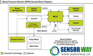 血壓計(jì)的基本功能是測(cè)量動(dòng)脈壁的壓力。其中一個(gè)獲得該測(cè)量數(shù)據(jù)的方法是使用一個(gè)可測(cè)量當(dāng)前壓力的壓力傳感器。血壓的不斷變化改變了控制空氣泵的電機(jī)的速率。氣囊壓向胳膊,使其產(chǎn)生收縮壓。當(dāng)達(dá)到收縮壓時(shí),圍繞在胳膊上的氣門會(huì)漸漸釋放空氣。同時(shí),壓力傳感器會(huì)進(jìn)行測(cè)量。