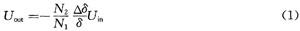 式中:Uin為勵(lì)磁電源電壓(單位V);Uout為輸出電壓(單位V);N1,N2分別為勵(lì)磁線圈和輸出線圈的匝數(shù);△δ為軸偏移平衡位置的距離(單位mm);δ占為軸處于平衡位置時(shí)的氣隙大小(單位mm)。