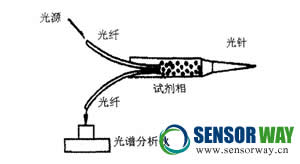 用來測定活體組織和血液值pH光纖光譜傳感器示意圖,如圖3所示。其工作原理是利用發(fā)射光、透射光的強度隨波長的分布光譜來進行測量。這種傳感器將兩根光纖插入可透過離子的纖維素膜盒中.膜盒內裝有試劑,當把針頭插入組織或血管后,體液滲入試劑,導致試劑吸收某種波長的光.用光譜分析儀測出此種變化,即可求得血液或組織的pH值。